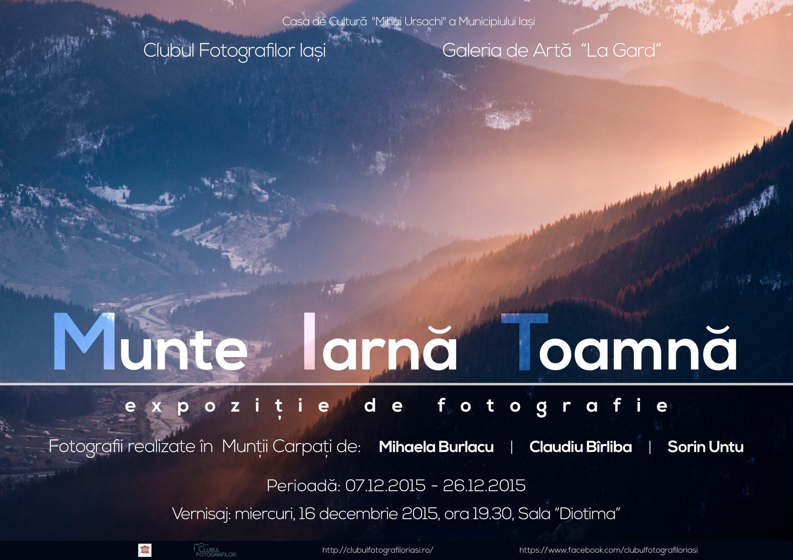 Multe cuvinte despre munte nu pot fi. Noi am ales imaginile. Trebuie să fi fost acolo pentru a simţi ce am trăit. Viscol, furtună de frunze, vânt, frigul de dimineaţă sau punctele acela care sunt fulgi şi nu murdării pe senzorul aparatului, nemarcate, lumină, creste atinse sau neatinse, între pământ şi cer, între două lumi. Voi sunteţi aici. Muntele Iarnă Toamnă. Voi sunteţi aici în sufletul nostru. Fotografiile au fost realizate între anii 2012 şi 2015 în Munţii Carpaţi din România. Vă aşteptăm la vernisaj!