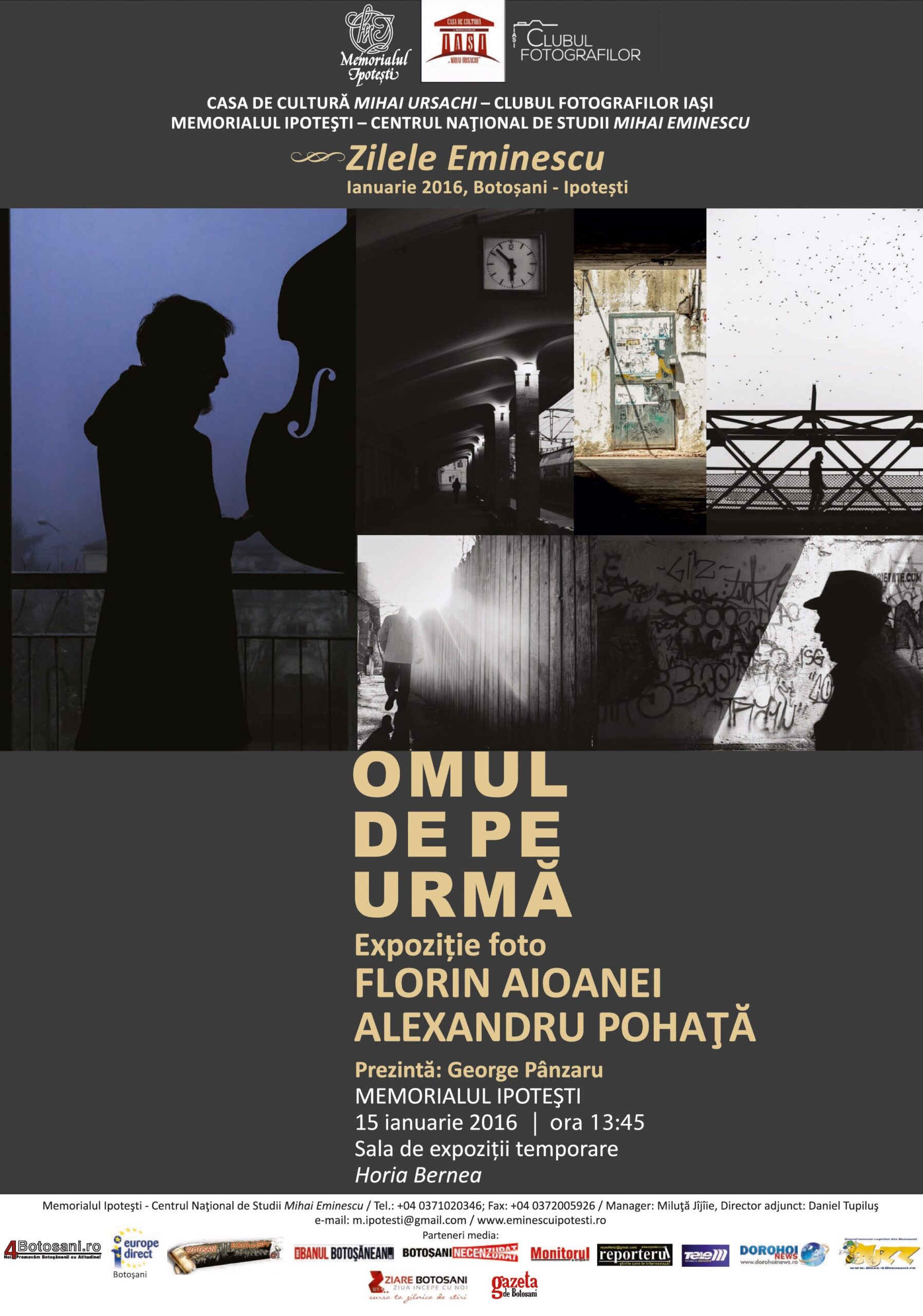 Cu prilejul Zilelor Eminescu Botoşani – Ipoteşti 2016 şi a Zilei Culturii Naţionale (15 ianuarie), Florin Marius Aioanei şi Alexandru Pohaţă, membri ai Clubului Fotografilor Iaşi şi absolvenţi ai Universităţii de Arte „George Enescu” din Iaşi, au selectat 30 de imagini în format 30X45, pe care le-au reunit în „Omul de pe urmă”. Fotografiile au încercat să găsească o ordine în dezordine şi să-i surprindă pe oamenii singuri din mulţime. Personajele nu au o identitate, ele fiind doar urme, aşa cum reiese din titlu. Autorii vă aşteaptă la vernisaj, unde vor oferi explicaţii şi autografe tuturor pasionaţilor de fotografie.